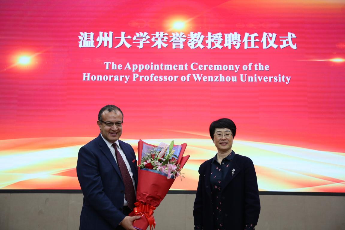 在聘任仪式上,校党委书记林娟娟致欢迎词并介绍学校金沙官网 办学历史和近年来在学科建设、国际科研交流与合作等方面情况,金沙官网 相关负责人介绍了金沙官网 在新型能源材料及电池研究取得的一些列成果,林娟娟书记为Khalil Amine教授颁发荣誉教授聘书并佩戴校徽,温州市高教园区建设管委会林照光主任为Khalil Amine教授颁发招才大使聘书。