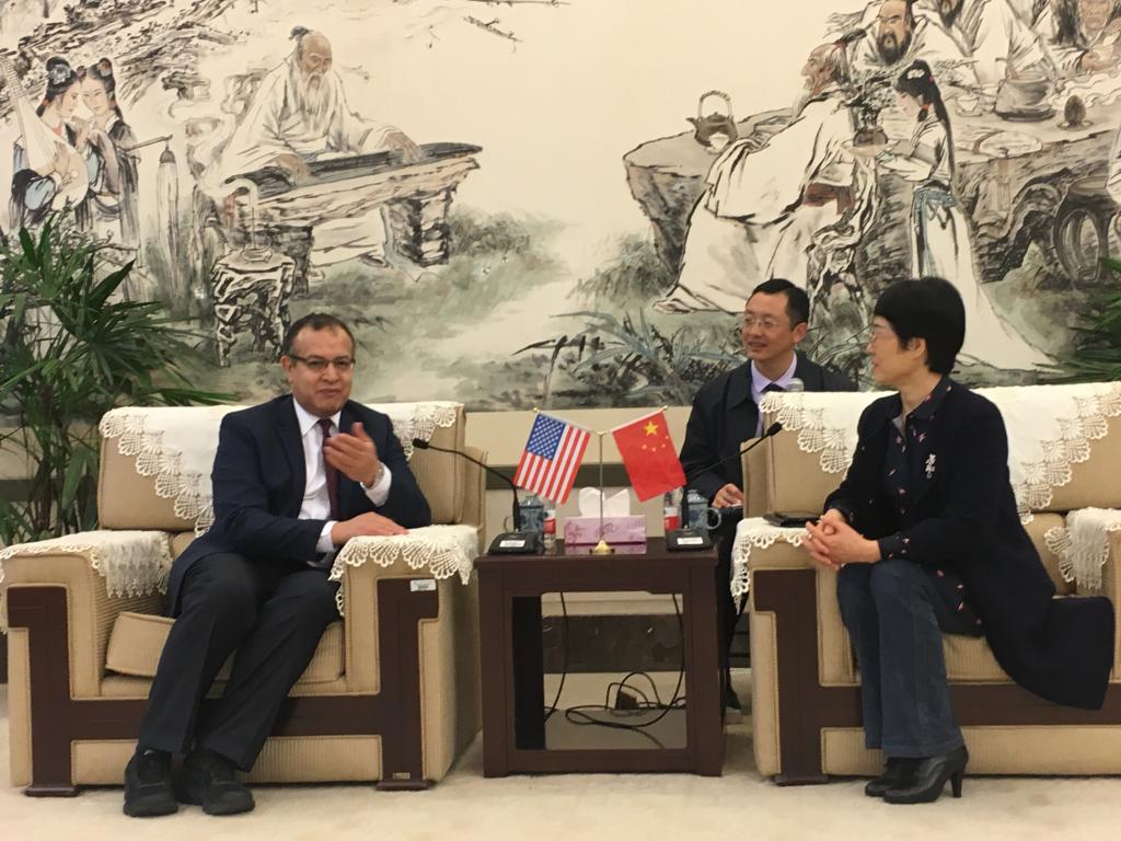 在聘任仪式前,校党委书记林娟娟在学校接见厅接见Khalil Amine教授一行,并陪同参观发绣所。