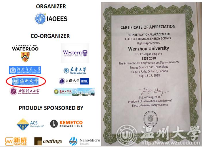 由温州大学协办的2018年第四届国际电化学能源科学与技术会议(The International Conference on Electrochemical Energy Science and Technology 2018, EEST2018)于8月13日-17日在加拿大尼亚加拉市召开,会议由国际电化学能源科学委员会与加拿大滑铁卢大学和西安大略大学共同主办(IAOEES),