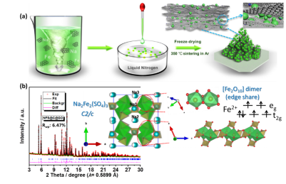 (a) Na2Fe2(SO4)3@C@GO的合成示意图;(b) 同步辐射XRD精修结果及示意图