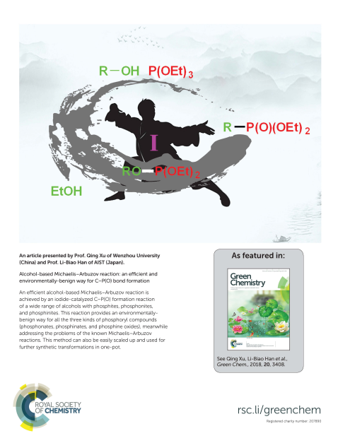 该研究成果被化学类权威一区期刊Green Chem.杂志所接受发表,并被邀请为期刊制作Back Cover插图(图3)。该工作是徐清教授课题组醇的绿色活化、C-P键高效构建有机膦合成等系列研究方向的延续与结合的一个研究新成果(Chem. Commun., 2011, 47, 2333;Angew. Chem. Int. Ed., 2014, 53, 225;Chem. Eur. J., 2016, 22, 6213;Adv. Synth. Catal., 2017, 359, 1649;等等)。该研究得到了国家自然科学基金面上及青年项目((21672163, 51502174, 21502143)、浙江省自然科学基金杰青项目(LR14B020002)、中国博士后基金(2016M592520)及深圳市科技项目(KQTD2016053112042971, 827-000113)的资助。