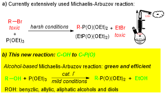 有机膦化合物广泛应用于有机合成、有机催化、药物、农药及阻燃材料,但多数有机膦化合物的C-P(O)键的构建方法还比较有限。C-P(O)键构建主要方法之一即是20世纪初发展的卤代烃与亚磷酸三酯的Michaelis-Arbuzov反应(图 1a)。该方法需使用活泼毒性大的卤代烃为原料、较高的反应温度,并会产生当量的小分子卤代烃如溴乙烷,环境污染较大,也会引发其他副反应,因而缺点明显。