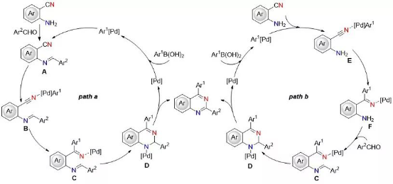 基于以上实验结果,作者提出了该反应可能经历的两条路径:(1)path a:首先芳基硼酸与钯催化剂通过转移金属化形成芳基钯物种,邻氨基苯甲腈与苯甲醛脱水缩合生成中间体A;然后A与金属钯配位形成中间体B,B再与芳基钯物种发生加成反应形成中间体C。(2)path b:芳基硼酸与钯催化剂先通过转移金属化形成芳基钯物种,然后与邻氨基苯甲腈中的氰基进行配位形成中间体E;接着芳基钯物种对氰基进行加成得到中间体F,F中的氨基再与芳香醛脱水缩合得到中间体C。最后,C经过分子内环合得到钯化合物D,再经过β-H消除得到目标产物喹唑啉衍生物。