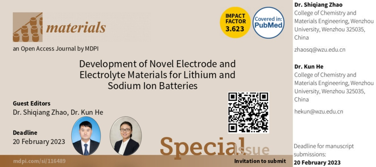 赵世强和何坤博士受邀担任国际期刊《Materials》(《材料》)的电池专刊“Development of Novel Electrode and Electrolyte Materials for Lithium and Sodium Ion Batteries”(锂/钠离子电池新型电极和电解质开发)的Guest Editor(客座主编)。