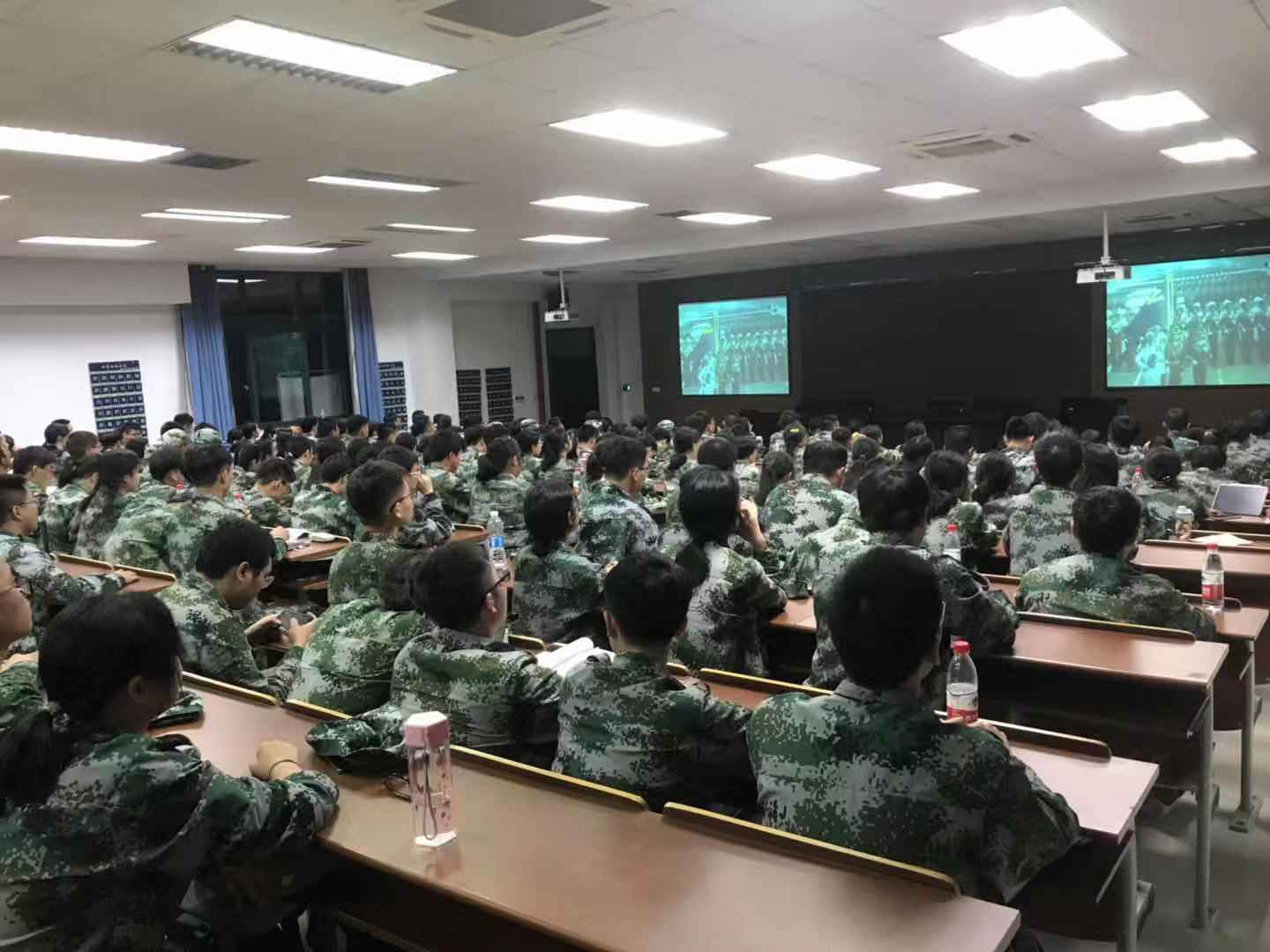 2019届全体新生齐聚11C401,观看国庆70周年阅兵视频。本次军事理论课学习由班助丁超主持。