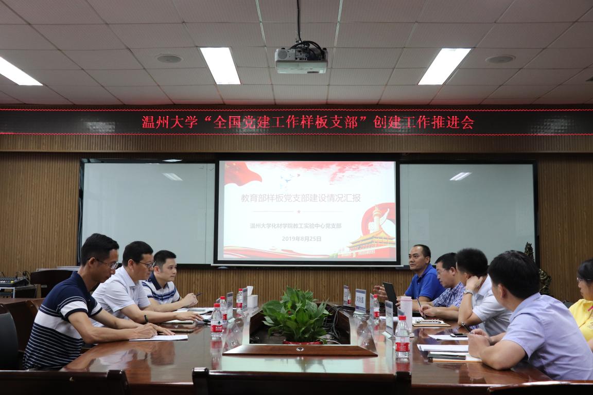 实验中心党支部获批全国党建工作样板支部培育创建单位。为进一步加强党建工作样板支部培育创建工作,推动新时代学校党建示范创建和质量创优,8月25日上午,学校在化材楼204会议室召开了全国党建工作样板党支部创建工作推进会。校党委委员、党委组织部部长郑信军,组织部副部长李祖祥等部门负责人出席会议,化材金沙官网