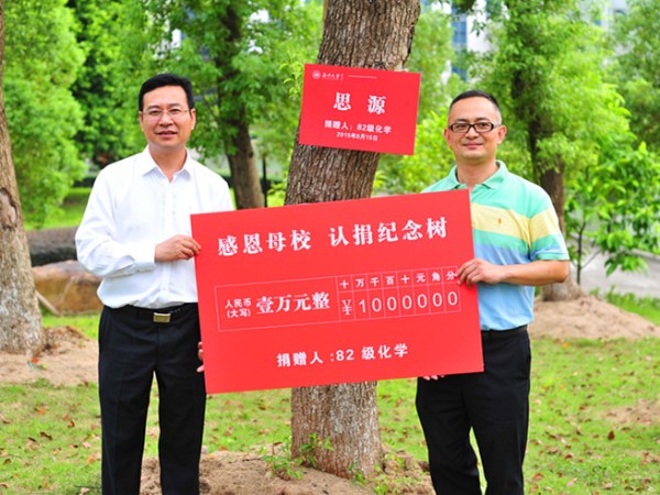 的持续关注和支持。在同学们简短的自我介绍后,陈迈、陈仁尔班长代表全体同学表达了对老师和学校的感恩之情,对同窗的深切友情。林娟娟副书记回顾了当年担任班主任的情景,真诚邀请校友常回母校看看,始终如一地关心母校和母院发展。为感恩母校,82化学校友向母校捐赠10000元,在校友林认捐“思源树”,寄托学子对母校的深情厚谊和感恩之情。为感恩金沙官网