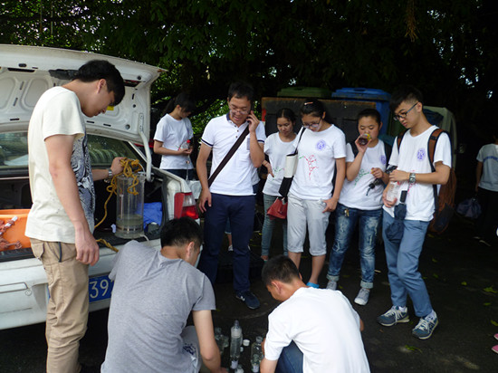 接下来,队员们又前往附近的另一条河。在环境监测局的专业指导下,调研组学到了取水技巧以及更多的专业知识,顺利圆满的完成了今天上午的水质检测工作。