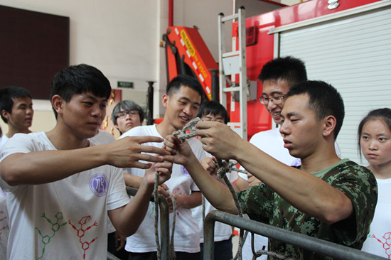 消防战士结合消防安全制度以及各类火灾案例,对如何树立公共消防意识、预防、杜绝可能引起消防事故的内外隐患、个人面对突发火灾事故应如何进行救灾及逃生等方面进行了全面的培训,教育队员们要牢记火灾给人类造成惨痛教训,时刻树立火灾防范意识,最大限度避免火灾的发生。与会队员深受教育,互相交流了自己的心得。随后,消防战士便带队员们下楼,亲自示范教大家两种救生结打法,分别是双平结和腰结。体验现场,队员人手一根绳子,你缠我绕,学得格外认真。暂时没轮上体验的队员则一面聚精会神盯着教官的手,一面在空气中试着比划,跃跃欲试。最后还进行了打绳结比赛,每个队员都表现得十分优秀。