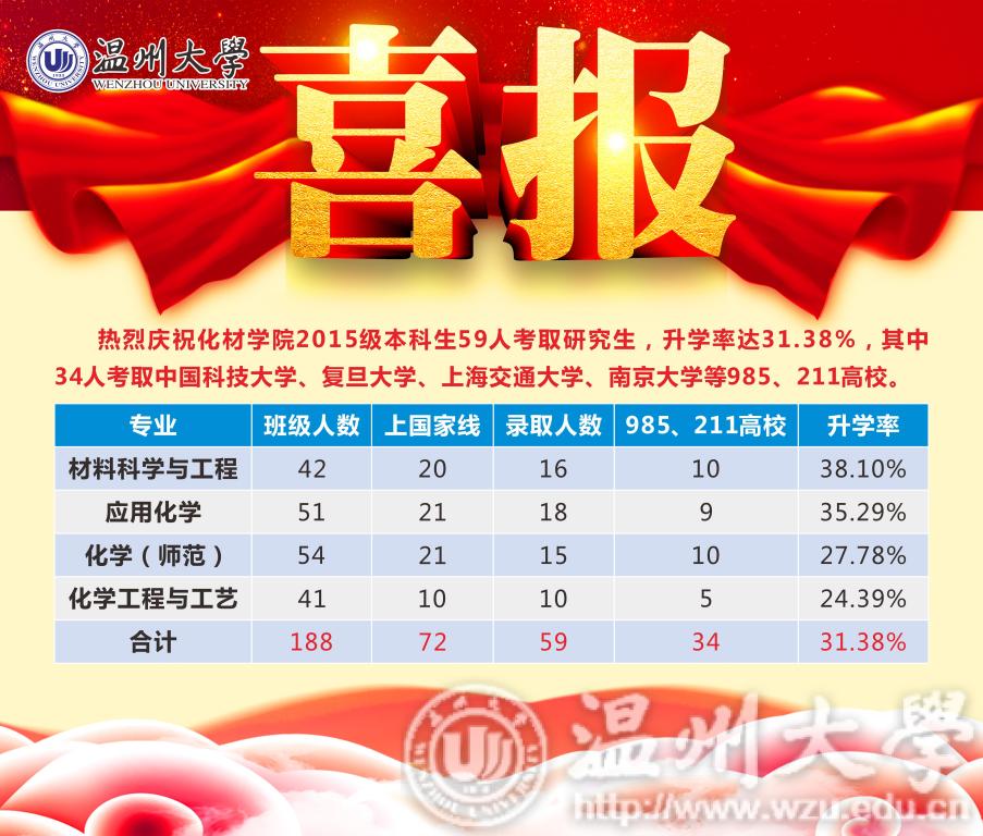 2019届毕业生共188人,90人报考研究生考试,71人过国家复试线,过线率达到报考人数的78.9%;其中59人成功被录取,录取率达到报考人数的65.6%,占全体本科毕业生数的31.4%;有34人被中科院、复旦大学、南京大学、上海交通大学等985、211高校录取,考研录取率和考取名校人数创历史新高。