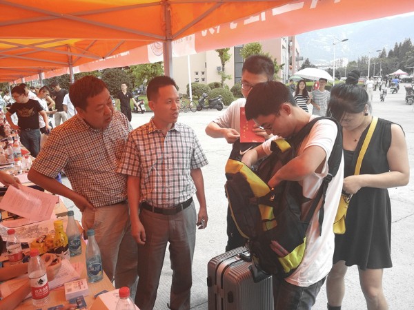 领导和新生班主任一早就在报到处迎接从全国各地赶来的每位新生及新生家长。