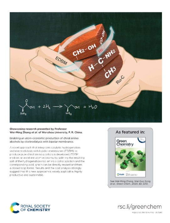 以上研究结果以“Enabling an atom-economic production of chiral amino alcohols by electrodialysis with bipolar membranes”为题,近日被选为inside back cover发表于Green Chemistry(DOI: 10.1039/ C9GC02460C)。我校金沙官网