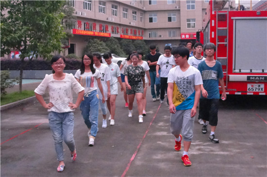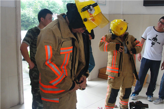 经过昨天下午消防官兵与实践队员们激动人心的篮球比赛后,实践队与消防战士们建立了深厚的友谊。今天早上9点整,班长徐顺苗战士便带领着实践队员到车库里学习如何穿戴消防装备。消防服一共分为四个部分,分别是上衣,下衣,帽子和腰带。徐班长先进行演示,之后由队员们一个个试穿,队员们分为两组,分别是男生队和女生队,进行男生女生大PK,比赛过程十分搞笑刺激,男生队和女生队比得热火朝天,你追我赶。最后出乎意料的是女生队竟然大获全胜。之后班长带领队员们看了消防战士的训练过程,战士们为了缩短救援时间,一次又一次不厌其烦的练习着,在这小小的训练场上挥洒汗水,让队员们打从心里崇拜他们。