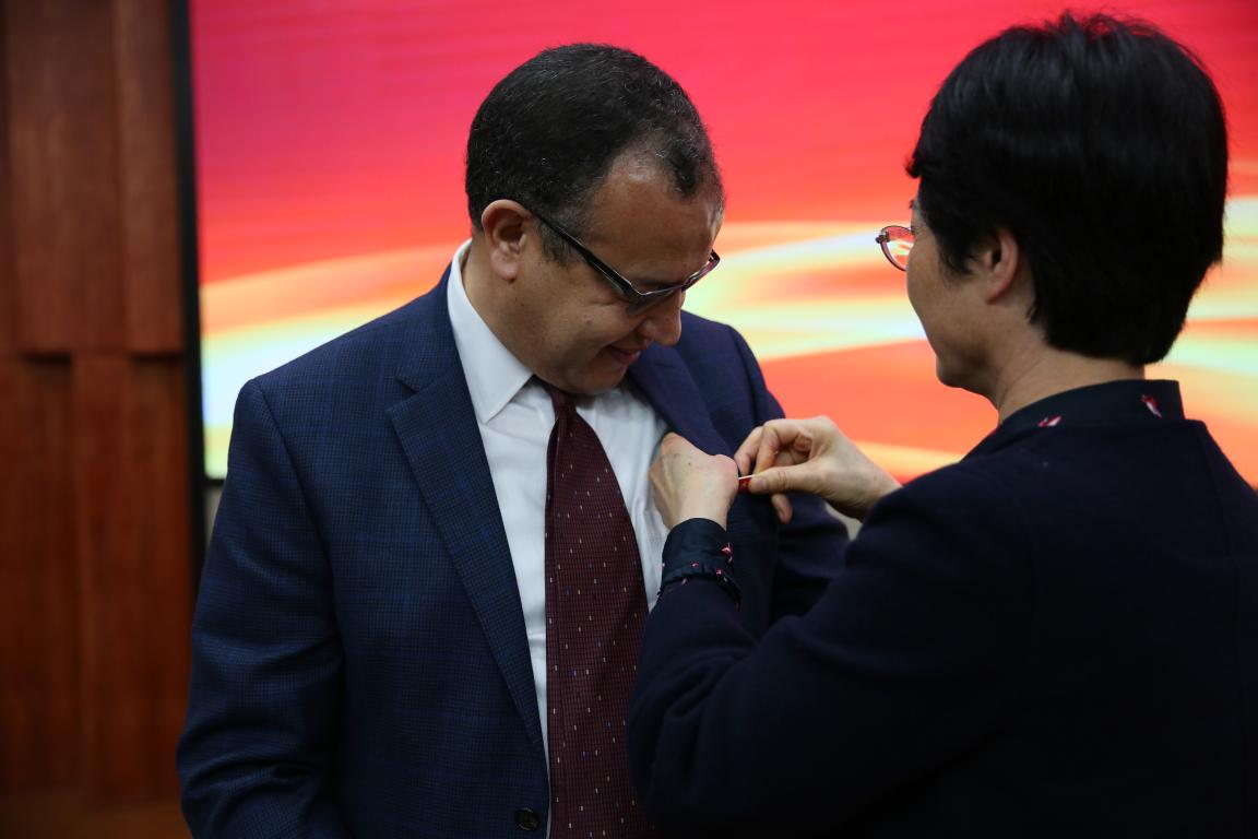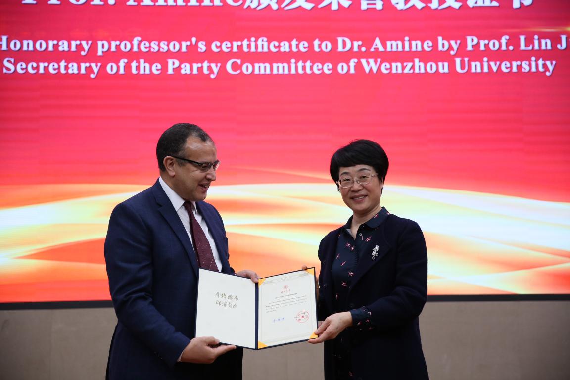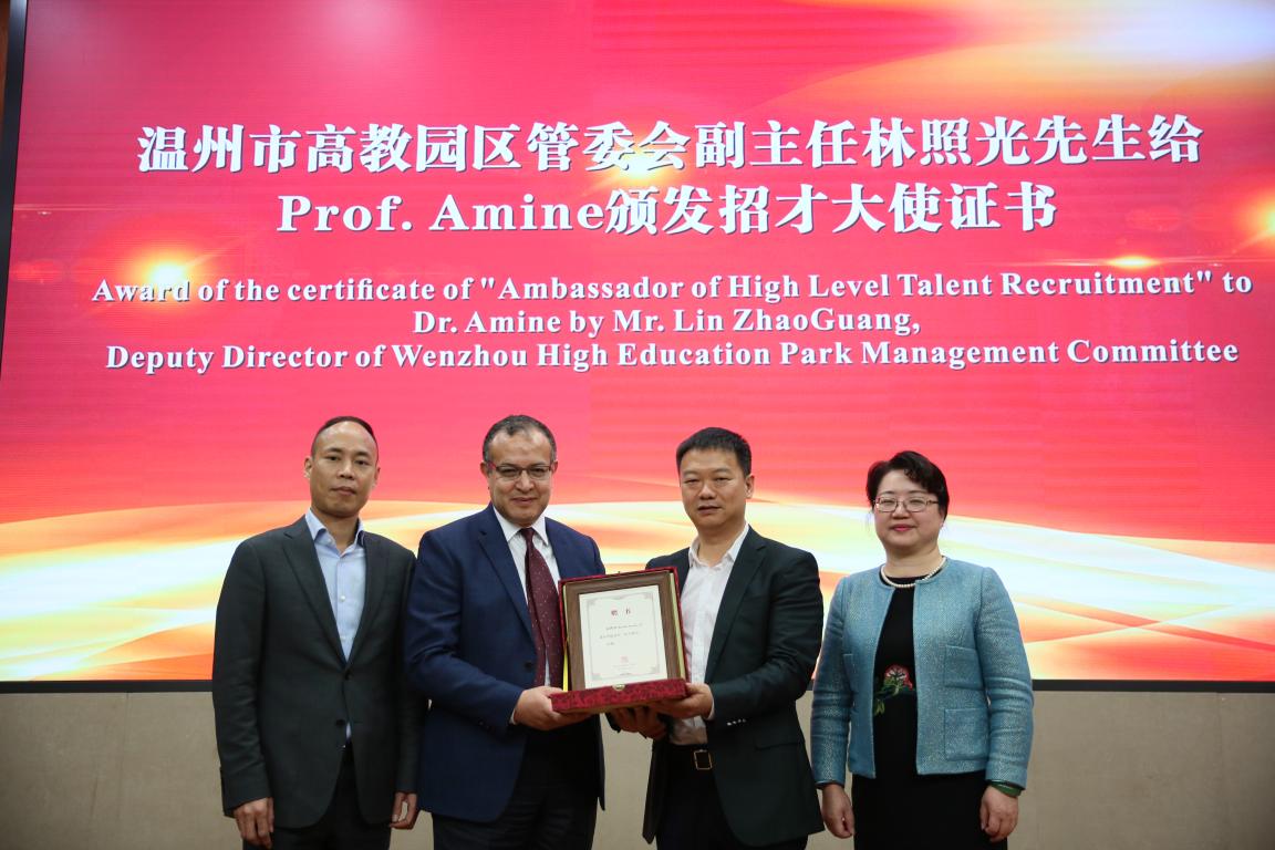 在新型能源材料及电池研究取得的一些列成果,林娟娟书记为Khalil Amine教授颁发荣誉教授聘书并佩戴校徽,温州市高教园区建设管委会林照光主任为Khalil Amine教授颁发招才大使聘书。