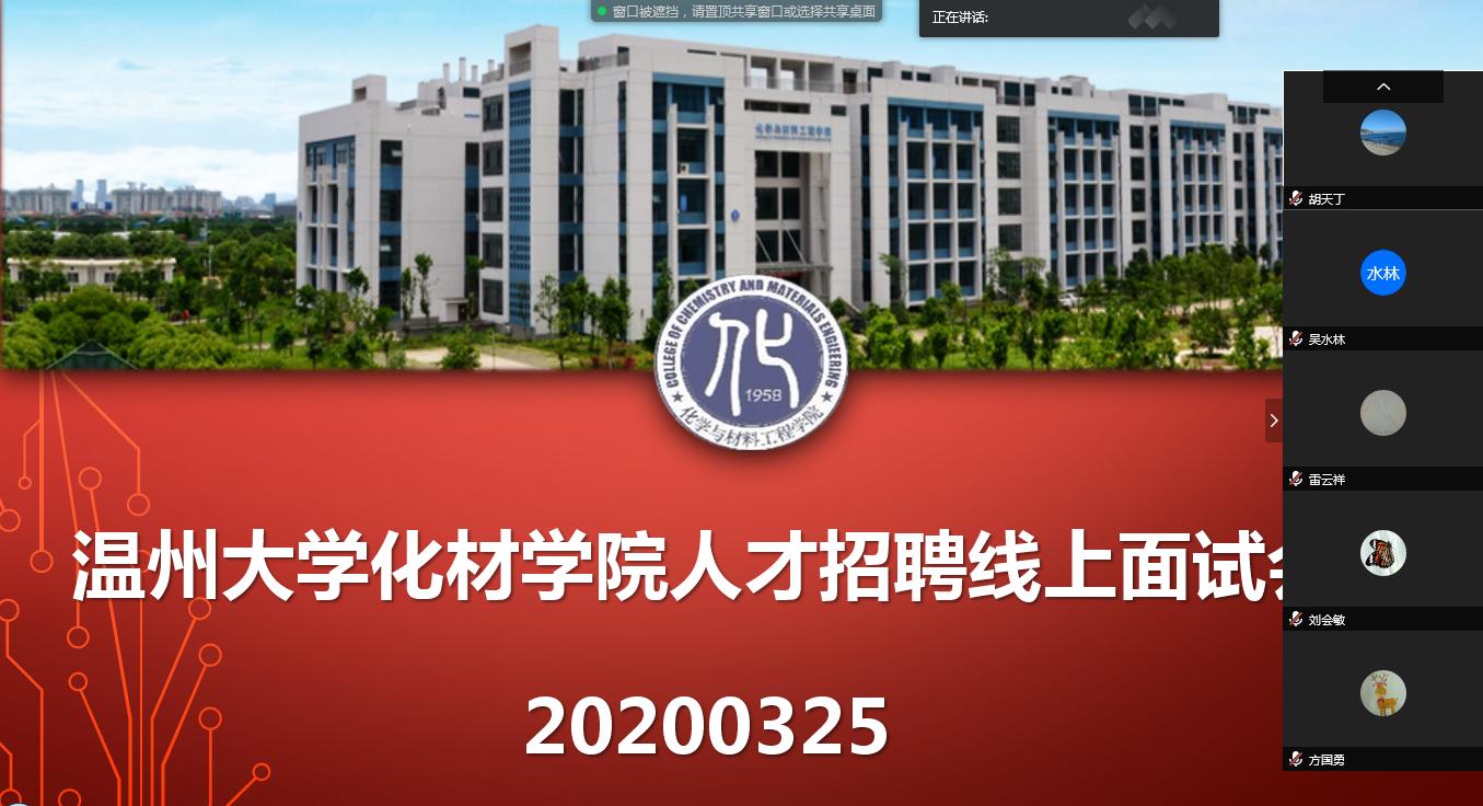 面对新冠肺炎疫情防控的严峻形势,金沙官网 严格执行温州大学新冠肺炎疫情防控工作的部署,在全面落实疫情防控工作要求的同时,积极推进“线上招聘”,确保疫情防控期间人才引进工作持续保持“在线”状态。3月25日起,金沙官网 网络视频面试工作正式“上线”,院长王舜、党委书记熊琳、学术委员会张兴国教授等参加了新学期第一场网络视频面试。