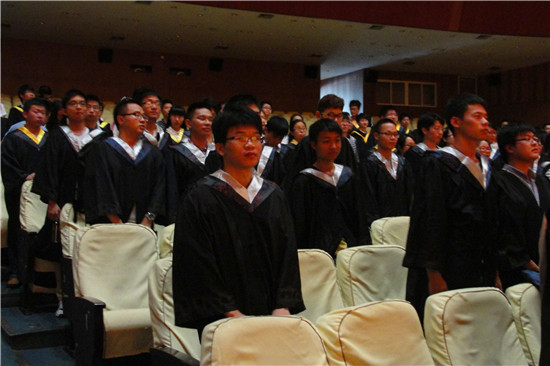 随后,10化本班班主任刘妙昌代表毕业班班主任发言。刘老师通过两个让人深思的问题:“你成为什么人?”、“为什么要成为这样的人?”展开自己的演讲,涉及到为人、处事、品格等方面,提出了使同学们受益终生的忠告及建议。10应化团支书吕骥麟代表毕业生上台发言。点点滴滴的大学生活拼凑出一段令人珍惜与怀念的记忆。成长、学习、思考、竞争,大学生活改变了一个人。老师对他的谆谆教诲让他记忆深刻:尝试比知识更重要。良师益友是人生之途的指向灯。吕骥麟同学朴实的话语让在座的每一位毕业生都动容。会上,与会领导还为校友联络员授予聘书。