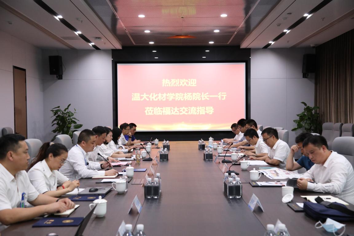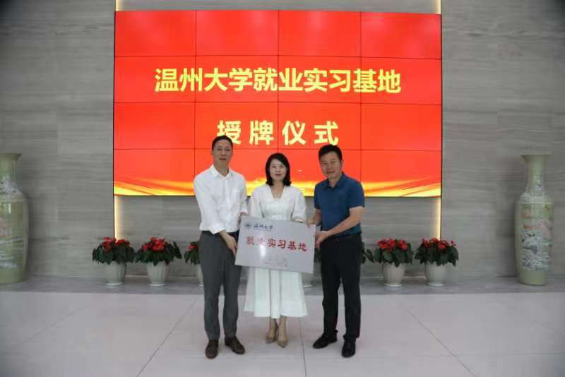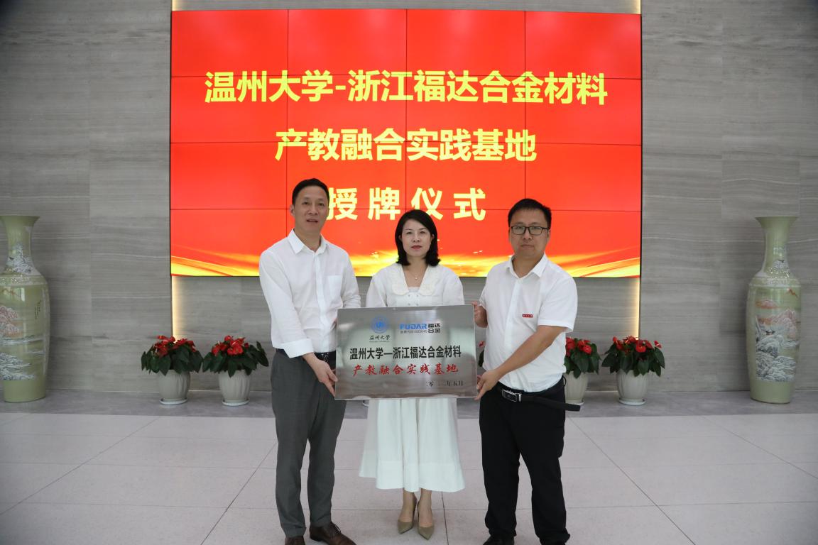 领导一行的来访表示热烈欢迎。会前,在经开区科技局李莲莲局长的见证下,校企双方进行了温州大学——浙江福达合金材料产教融合实践基地授牌仪式以及温州大学就业实习基地授牌仪式。