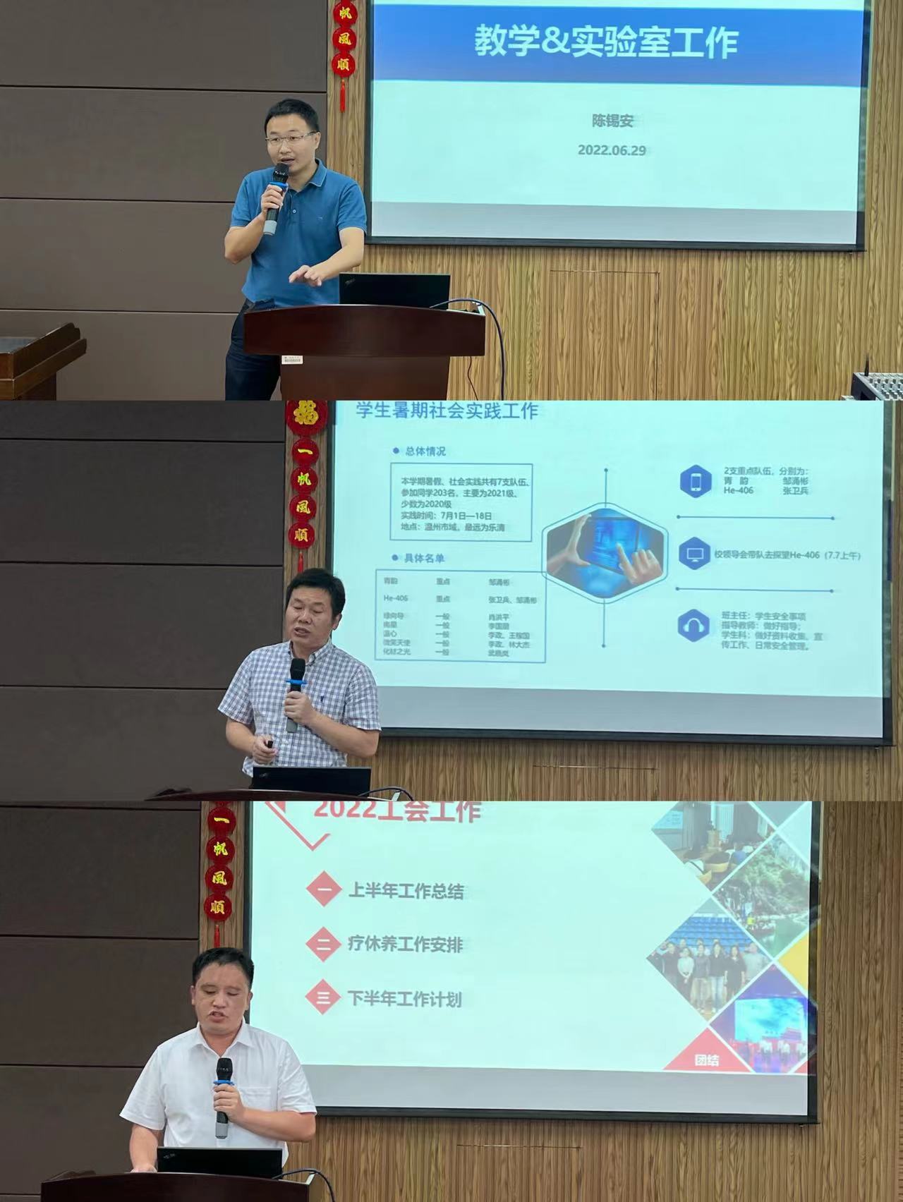 各分管领导对本学期的工作进行总结并对暑期相关工作进行部署。陈锡安副院长对教学、实验室工作的各项进展进行了汇报,他指出金沙官网