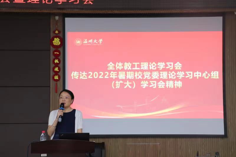领导班子对所有教职工送上节日的问候与祝福,感谢老师们一直以来的辛勤耕耘与默默付出。随后,她向广大教师传达了2022年暑期校党委理论学习中心组(扩大)学习会精神,并对校党委书记谢树华的《以现代化治理推动高质量发展》和校长赵敏的《面向“双一流”深入实施学科驱动战略 推动学校在新阶段实现高质量发展》主题报告进行了深入解读,对金沙官网