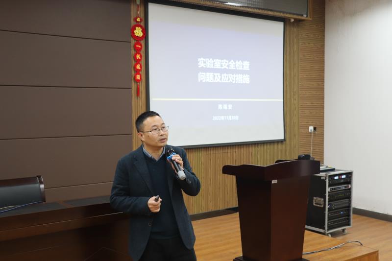 副院长陈锡安结合学校实验室安全检查存在的问题进行了通报。主要就实验室安全用电、消防设施、个人防护、通风橱使用、化学品存放、公共卫生等方面的问题进行了详细的介绍并提出了明确的整改措施。他呼吁广大教职工真正做到心中有责任、眼里有细节、实验讲规范、安全有保障。