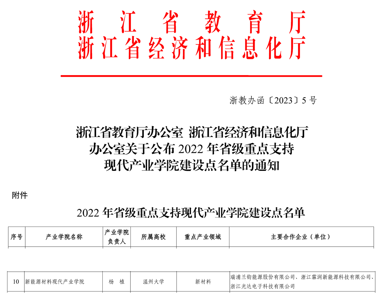 联合瑞浦兰钧能源股份有限公司、浙江霖润新能源科技有限公司、浙江光达电子科技有限公司申请的“新能源材料产业研究院”成功获批。
