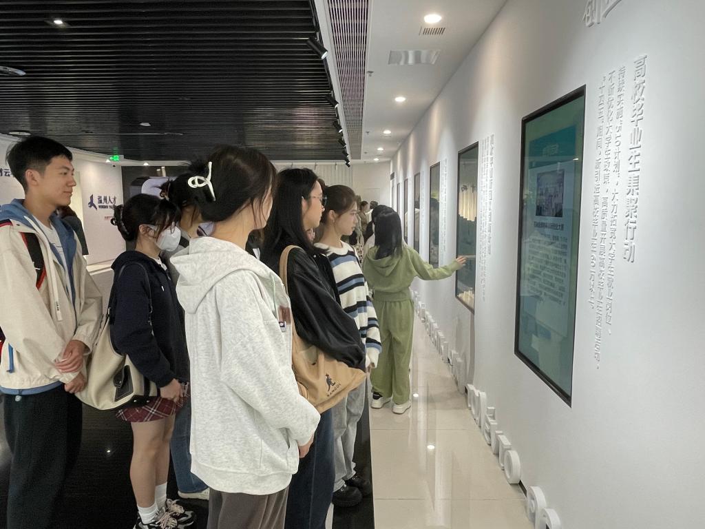 支部党员们共同参观了“瓯江红”党建人才综合体,学生党员穿过时光走廊,在党史教育馆回顾光影中的峥嵘岁月,震撼的光影故事充分展示了中共党史和温州党史的光荣岁月。来到人才政策厅,在讲解员的介绍下体验了独特的人才政策计算器,感受着温州“人才强市、创新强市”的战略魅力。在党群服务区,大家共同了解乡村全面振兴的共富路,一同感受共同富裕示范先行的感人故事。