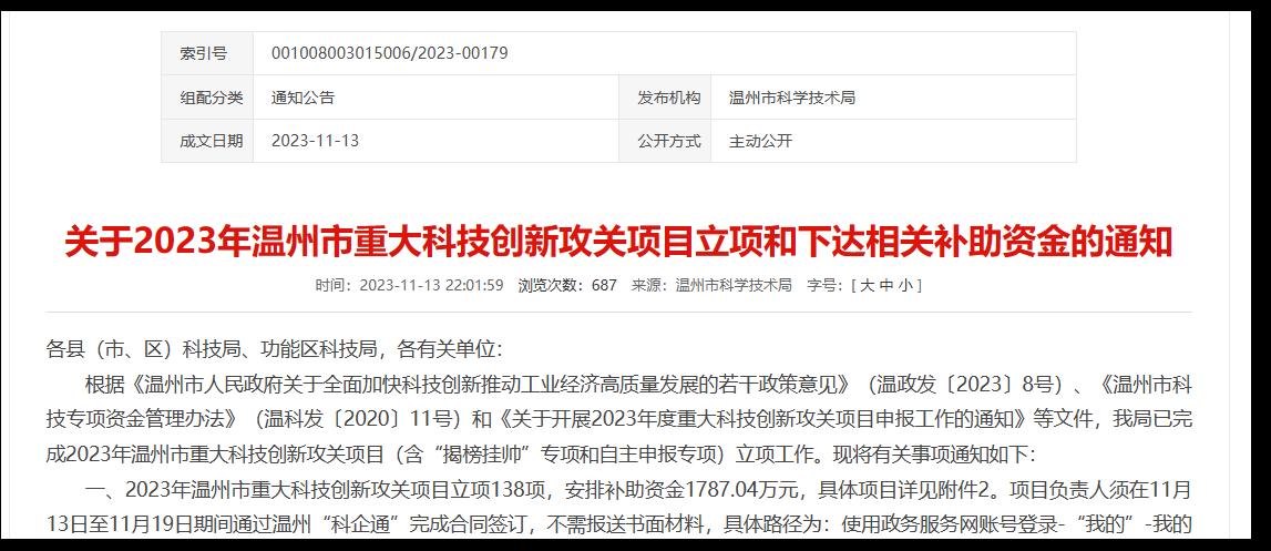 近日,根据《温州市人民政府关于全面加快科技创新推动工业经济高质量发展的若干政策意见》(温政发〔2023〕8号)、《温州市科技专项资金管理办法》(温科发〔2020〕11号)和《关于开展2023年度重大科技创新攻关项目申报工作的通知》等文件,由金沙官网