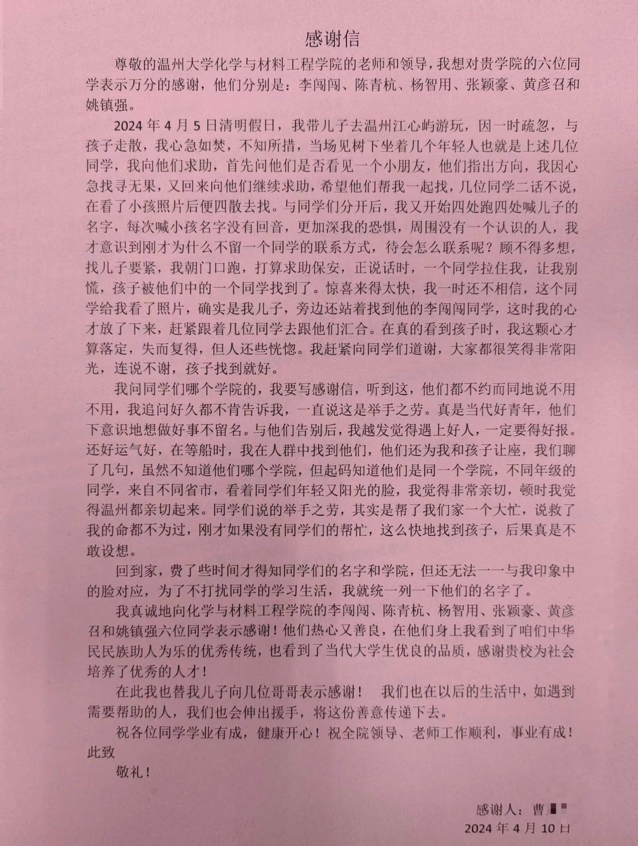 李闯闯、陈青杭、杨智用、张颖豪、黄彦召和姚镇强六位同学伸出援手,他们不仅积极帮助寻找,还最终成功找到了走失的孩子,使曹女士一家得以团聚。
