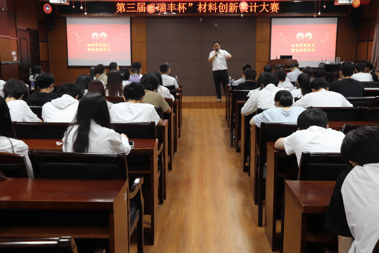 学工办、温州市瑞丰控股集团有限公司在11B208会议室联合举办了第三届“瑞丰杯”材料方案创新设计竞赛。瑞丰控股集团董事长周赛珍女士;瑞迪新材料有限公司总经理张国忠先生;瑞迪新材料有限公司品保部主管田文斌先生;金沙官网-金沙集团官网
