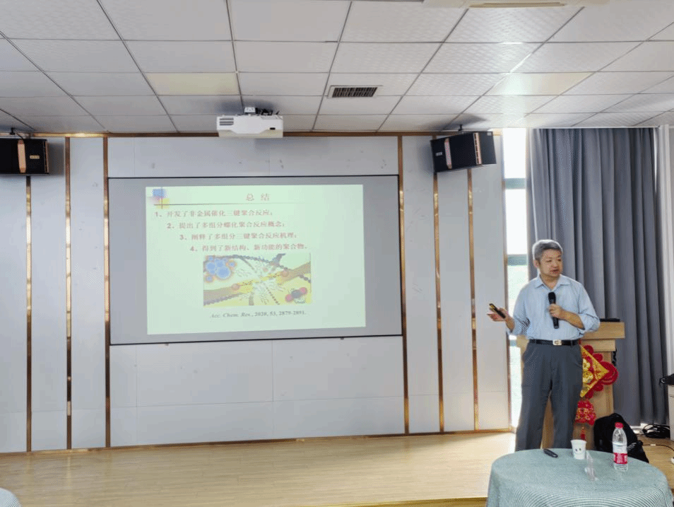 报告结束后,董宇平教授进行现场答疑。现场师生对于三键聚合新反应与新方法产生了浓厚的兴趣,参加的老师和学生提出了多个相关问题,董宇平教授对提问进行了详细解答,并同参会的老师进行了深入探讨。这次讲座让师生们对聚集态结构与性能之间的关系的研究有了更深层次的了解,激发了师生们对三键聚合新反应与新方法研究的兴趣。