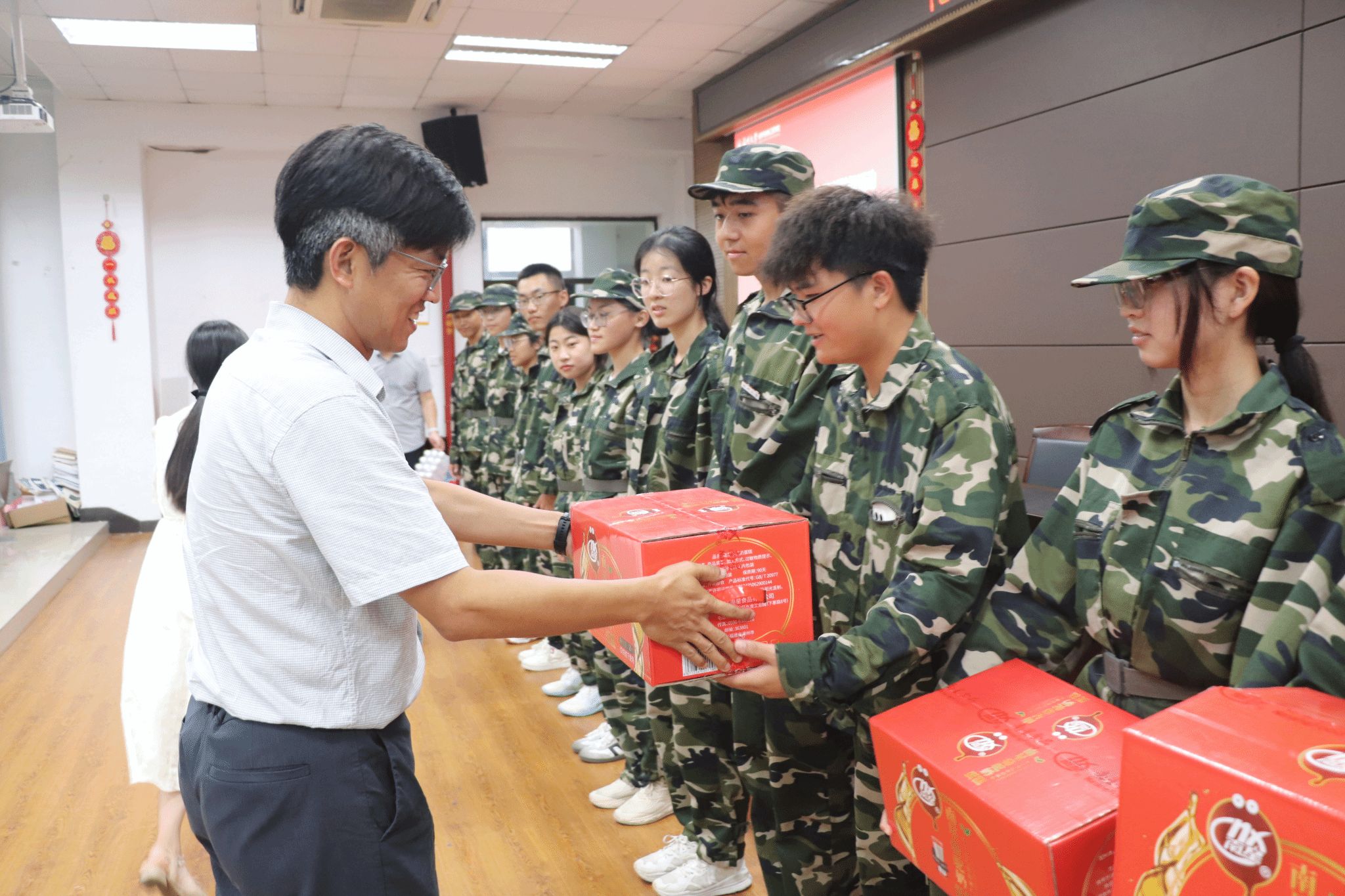 邹超书记为新生军训代表发放慰问物资