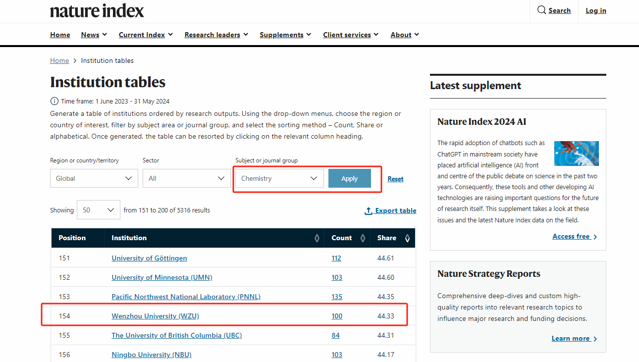 近日,自然指数官网更新了最新的自然指数排名(统计时间节点为2023.6.1-2024.5.31),我校化学学科在此次统计周期内排名全国第77位,全球第154位,再创历史新高。