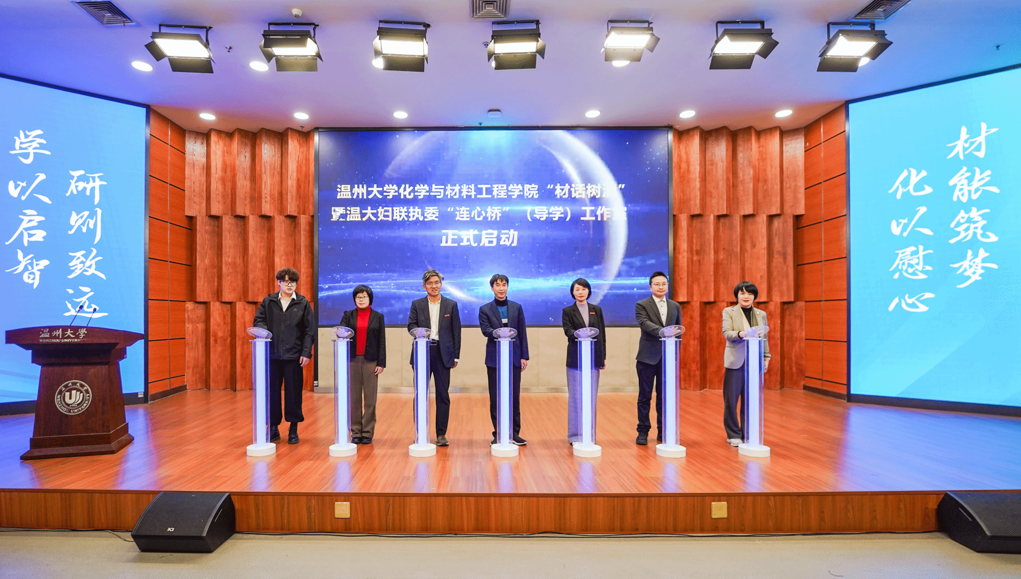 黄文浩部长、陈文远副主席、邹超书记、金辉乐副院长、潘跃晓教授、王晓华副书记、硕博代表东洋洋上台共同开启温大化材“材话树洞”暨温大妇联执委“连心桥”(导学)工作室。
