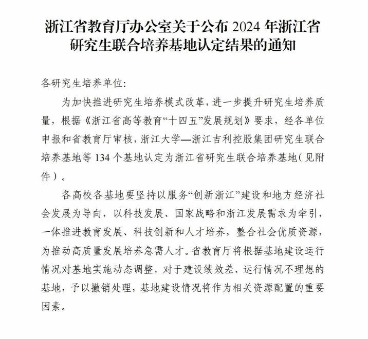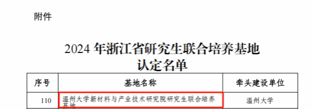 近日,浙江省教育厅发布《关于公布2024年浙江省研究生联合培养基地认定结果的通知》的名单,温州大学新材料与产业技术研究院研究生联合培养基地成功认定为省级研究生联合培养基地。这一认定标志着金沙官网