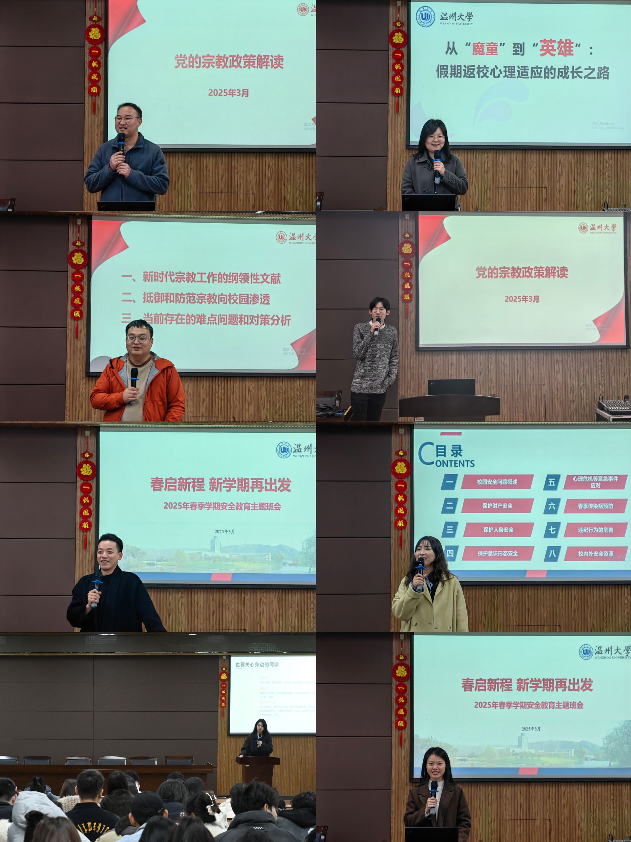 各年级辅导员结合《温州大学宗教工作知识手册》与典型案例,深入解读党的宗教政策与法律法规,强调大学生应秉持科学精神、坚守社会主义核心价值观,引导学生理性看待宗教问题,严守"教育与宗教相分离"原则。