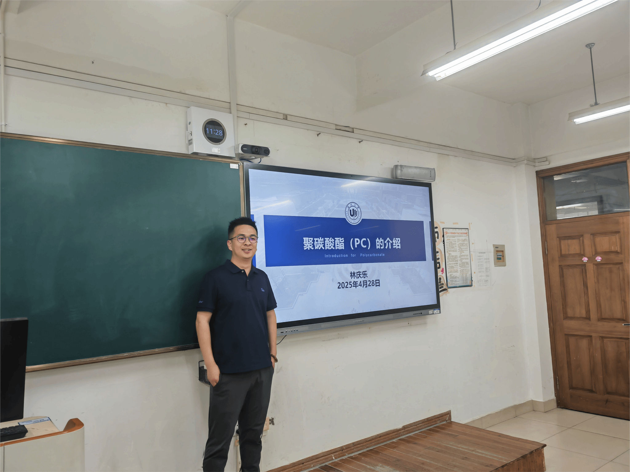 2006级材料专业优秀校友、温州泰鑫塑业有限公司总经理、宁波天维新材料有限公司营销总监林庆乐先生作为主讲嘉宾,他以《聚碳酸酯(PC)的介绍》为主题,为金沙官网