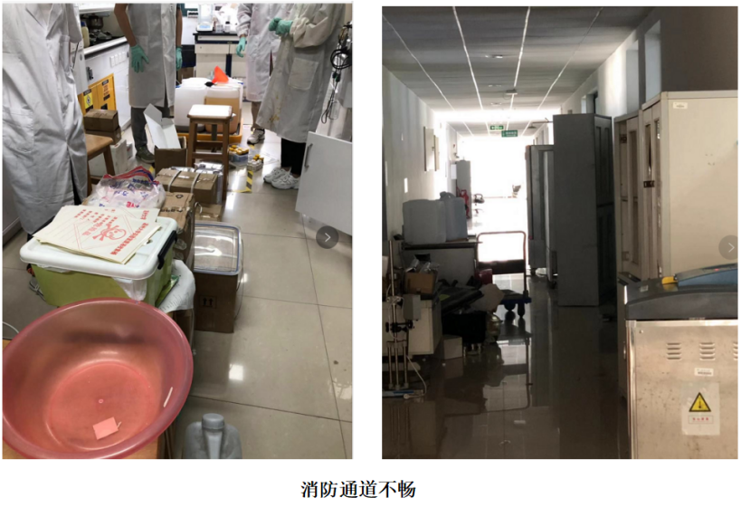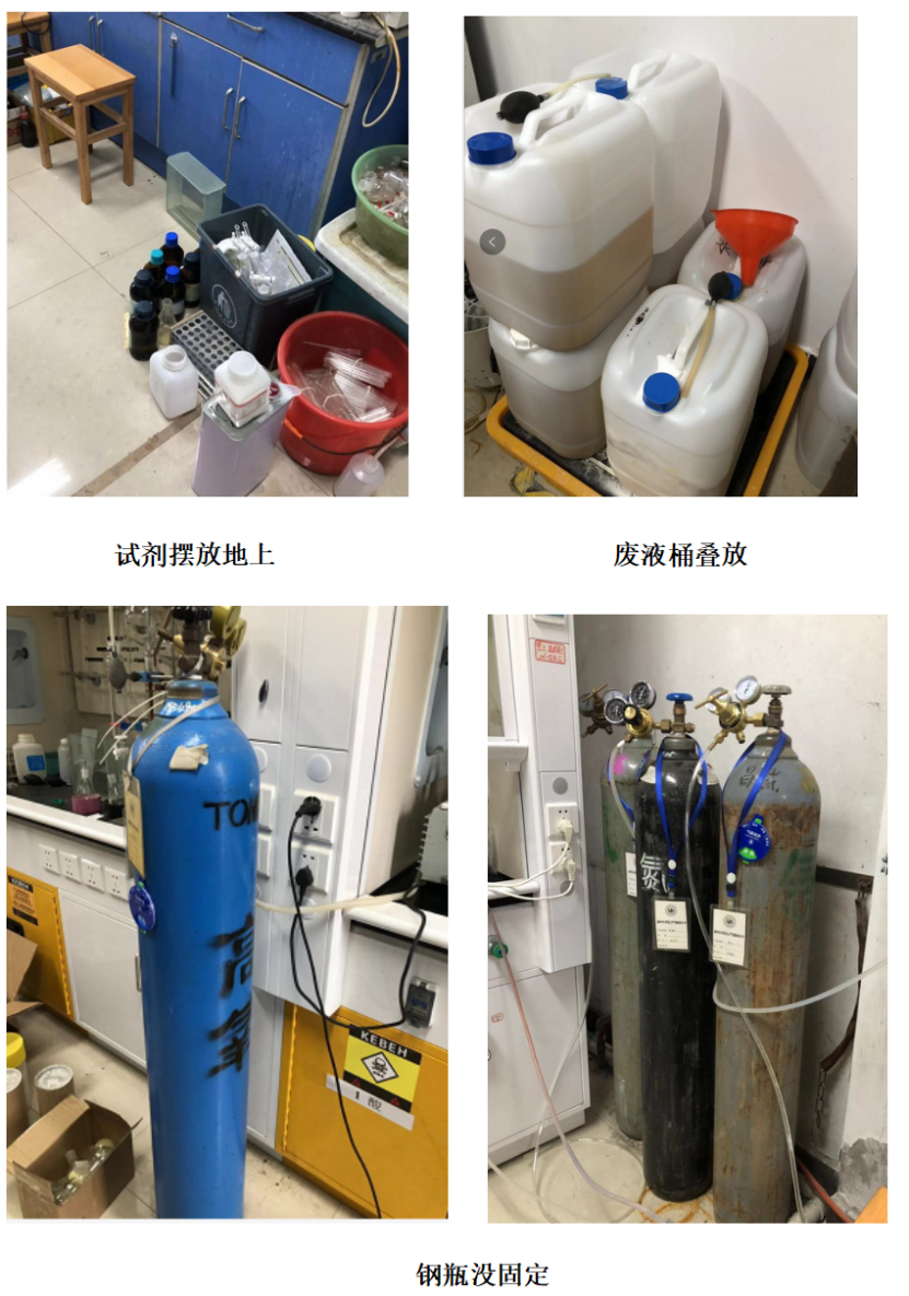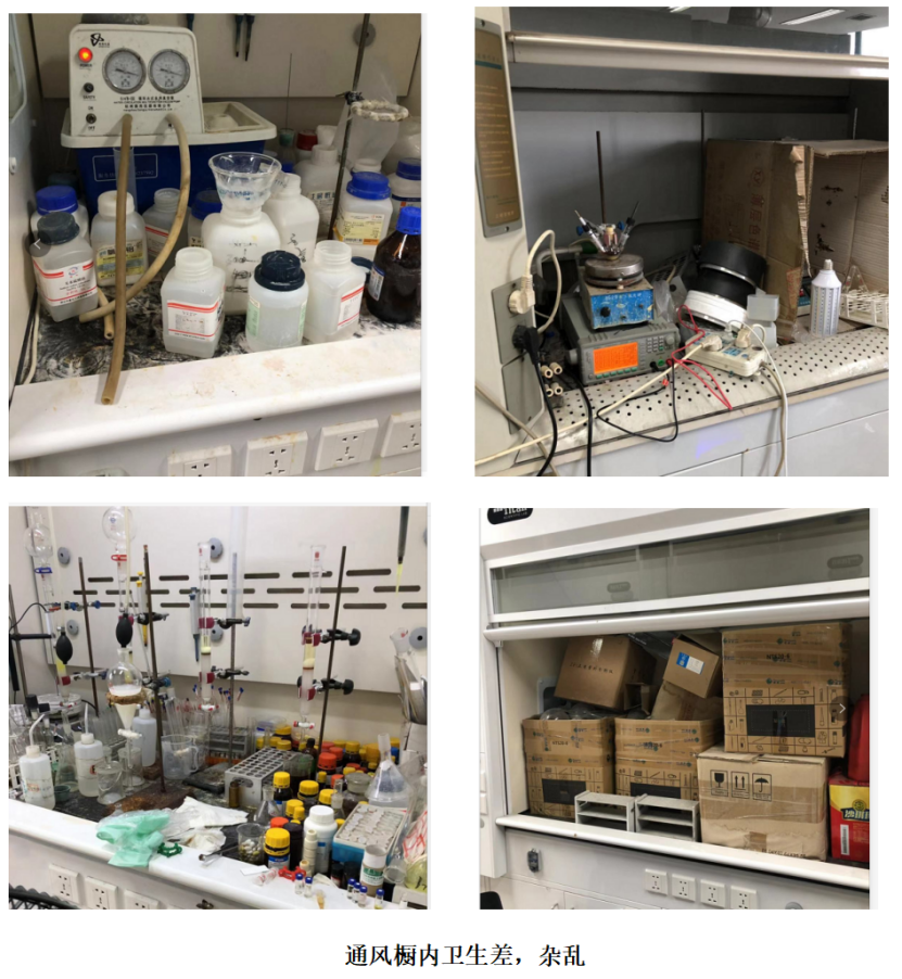 1、通风橱内卫生差、物品摆放杂乱;2、较多学生未实验服;3、实验室内溶剂存放量大;4、试剂瓶摆放地上;5、电吹风外壳为塑料材质,须采用金属外壳电吹风。请各位责任人对照自查,有则改之!