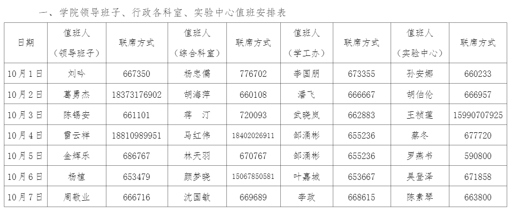 领导班子、行政各科室、实验中心值班安排表