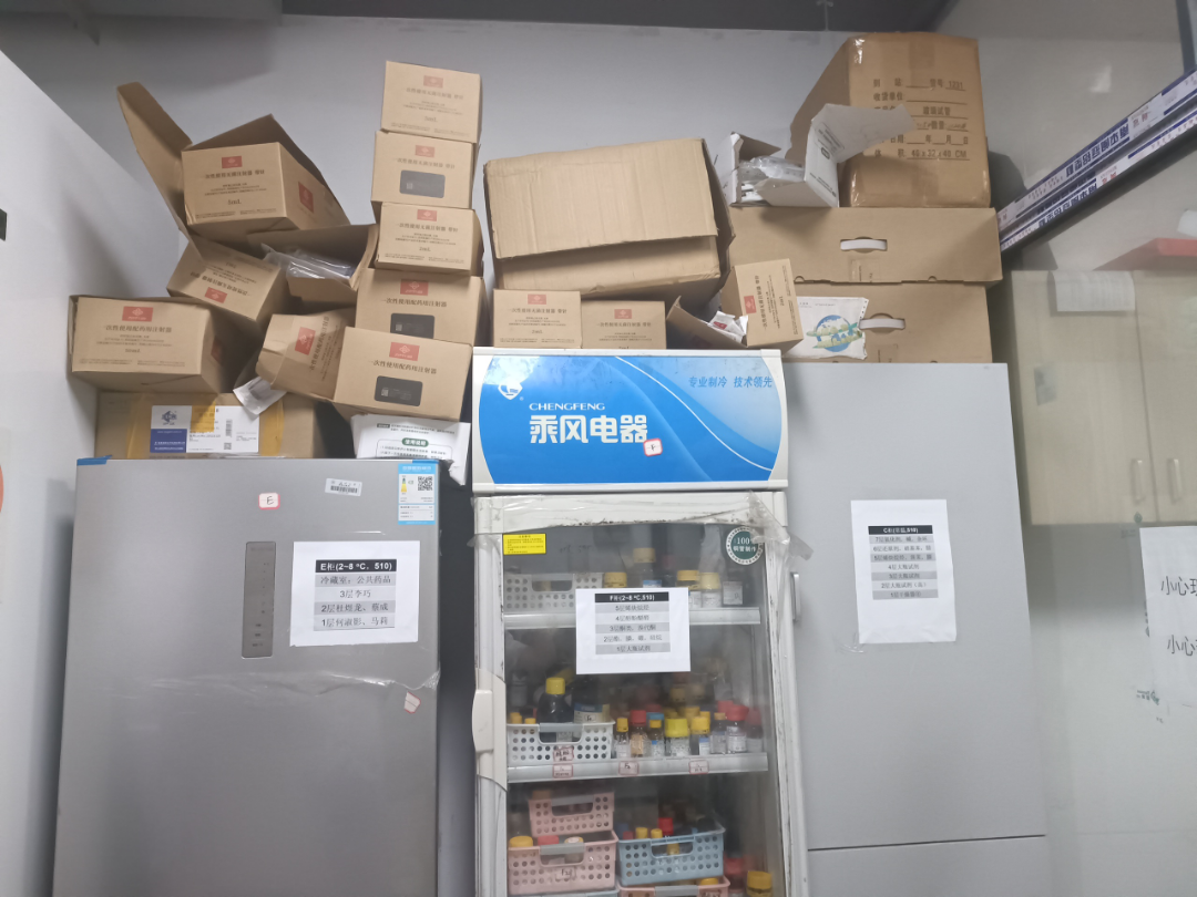 地面卫生差;堆积纸板箱;试剂瓶未贴标签 |
