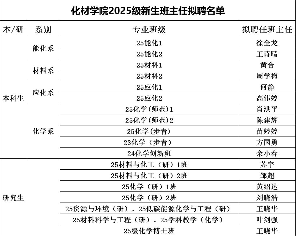 2025级新生班主任名单及带班情况进行公示。