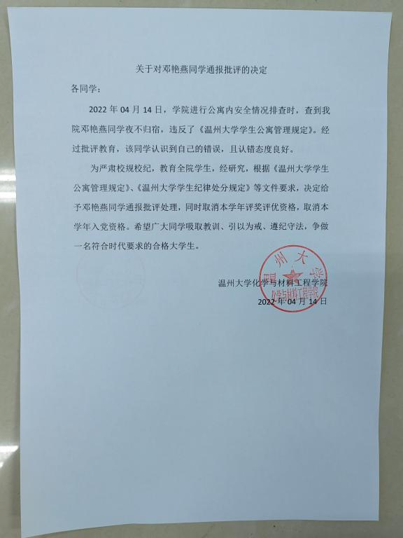 关于对邓艳燕同学通报批评的决定