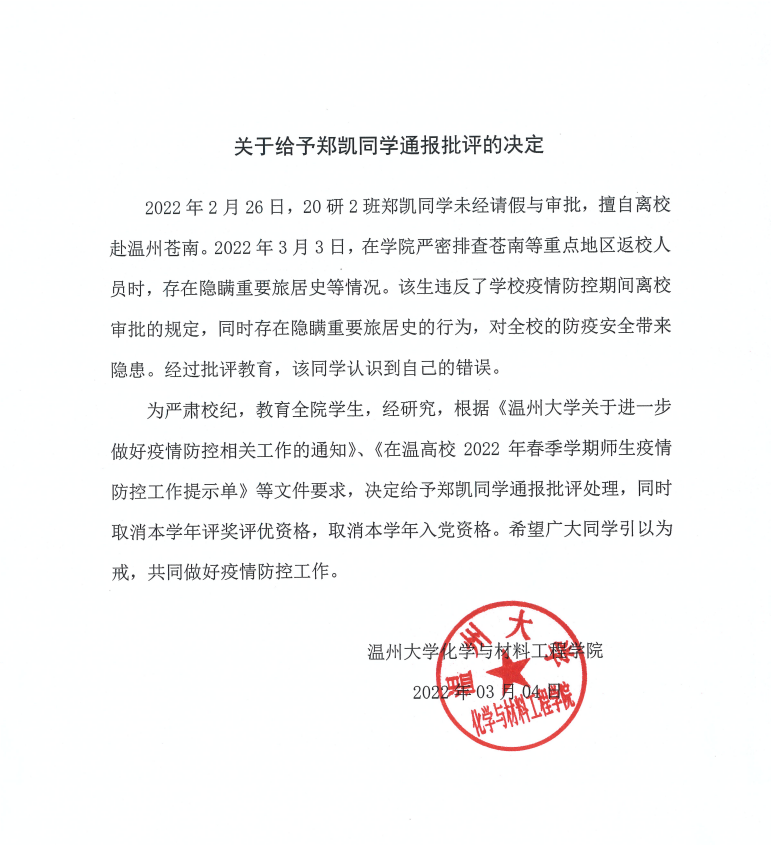 关于给予郑凯同学通报批评的决定