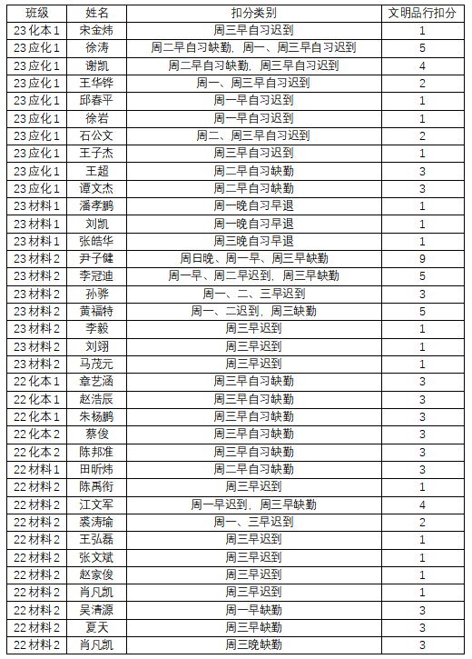 大一、大二早晚自习管理规定(201809修订)》,1次早、晚自习缺勤扣3分,学业发展部将在每周在“温州大学化学与材料工程金沙官网