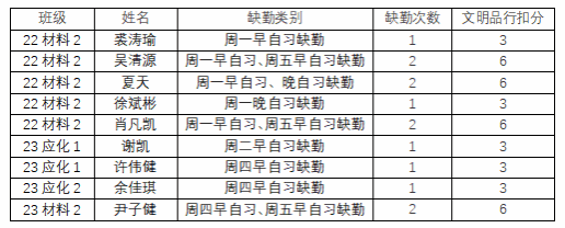 ”微信公众号平台公布本周考勤结果,如对公布的考勤结果有异议请当周周五下午4:30前到学生科办公室11B223说明情况,过时无效。22级、23级联系邹培杰老师。