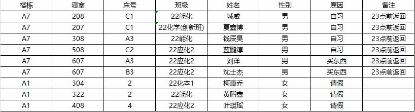 (1)请假的学生需由舍友出示请假材料;