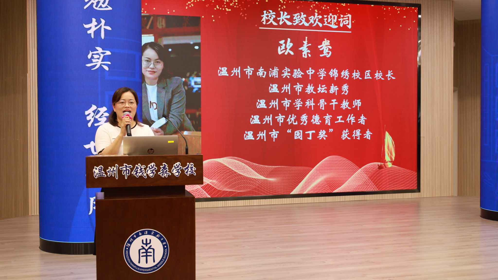 仪式伊始,南浦实验中学锦江校区校长欧素鸯致辞,她对温州大学师生的到来表示热烈欢迎!她强调了化学科学教育对中学生创新思维、实践能力等综合素质发展的重要性,同时希望参加夏令营的同学们能珍惜这次来之不易的学习机会,要善于向优秀的老师们学习,欧校长对实践队成员寄予厚望,希望南浦实验中学与实践队能够长期合作。