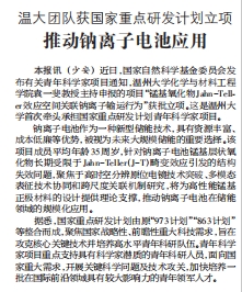 温州日报:温大团队获国家重点研发计划立项 推动钠离子电池应用