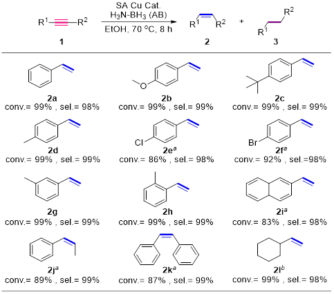 张剑课题组与清华大学王定胜课题组合作提出了一种新颖的复合氧化物策略来有效降低CN负载的Cu单原子催化剂的N原子配位数,从而使以氨硼烷作为氢源的炔烃选择性转移氢化反应得以在Cu单原子催化下顺利实现。