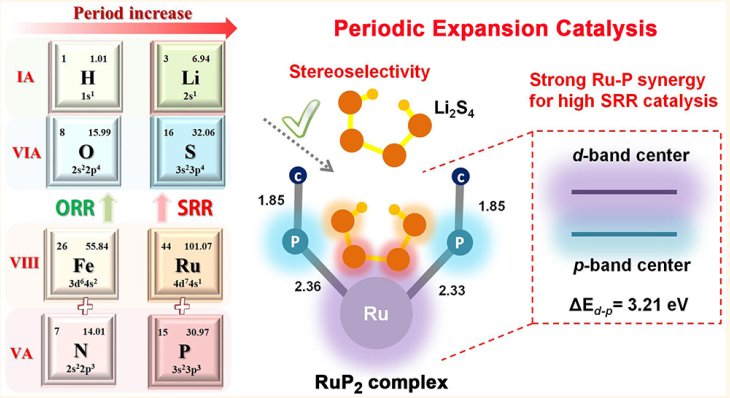 近日,我校杨植教授课题组在国际著名化学期刊《ACS Nano》发表了题为”Sulfur Reduction Catalyst Design Inspired by Elemental Periodic Expansion Concept for Lithium–Sulfur Batteries”的论文。该工作受启发于天然酶中Fe/N活性位点具有高效的氧还原反应特性(Fe/N→ORR),提出周期扩充催化的概念:利用位于Fe/N下一周期的Ru/P,构建仿生催化分子,协同催化锂硫电池中硫的还原反应(Ru/P→SRR)。