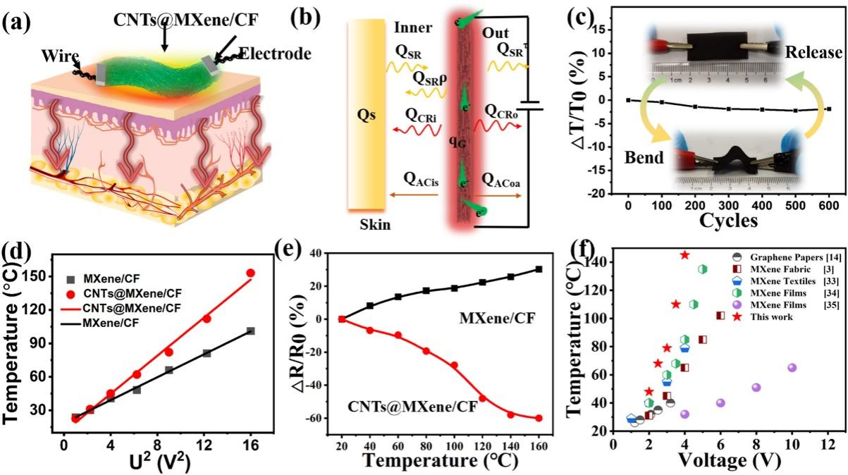 所制备的CNTs@MXene/CF具有出色的焦耳加热性能,包括快速响应时间(在20 s内),低驱动电压和长期耐用性。在400 mW/cm2的光照强度下,CNTs@MXene/CF复合材料的表面温度上升到105 ℃。此外,利用CNT-MXene异质结构和完整的层状MXene微结构,保留了连续的电子转移路径,CNTs@MXene/CF复合膜表现出出色的EMI屏蔽性能。我们预计,该策略制备的多功能CNTs@MXene/CF复合膜在未来的治疗电子领域的个人治疗中具有良好的应用潜力。